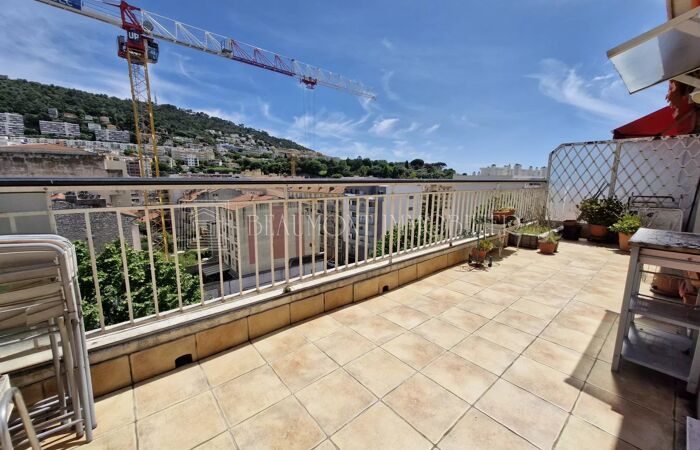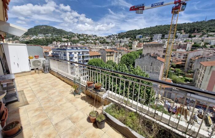 Exceptionnel Nice Riquier à 2 pas du Tram et de la Place Garibaldi, 2P au 7ieme et DERNIER ETAGE offrant une vue dégagée, Terrasse 18m², Belle pièce à vivre avec cuisine ouverte de 26m², chambre en Parquet avec placard, jolie salle d'eau, cave et garage de plain pied inclus.