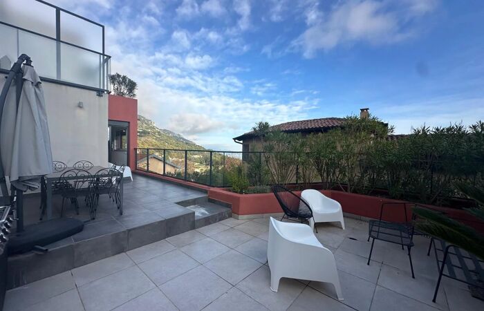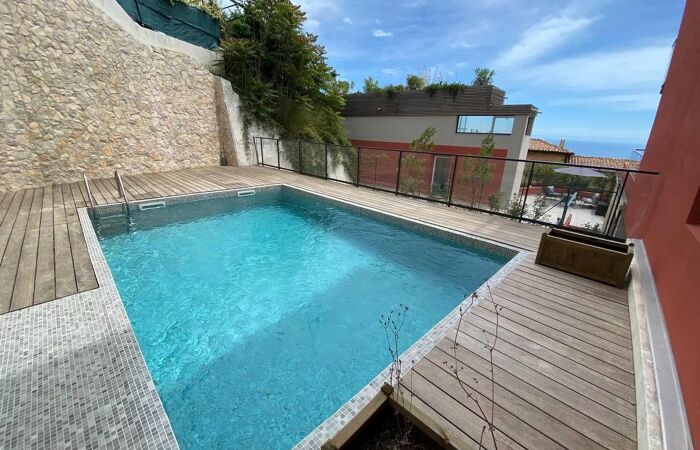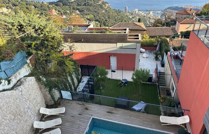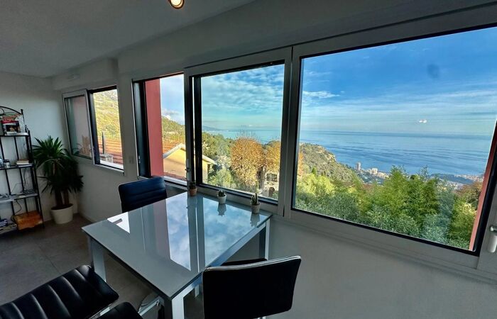 Villa avec vue sur la mer et Monaco - La Turbie Située sur les hauteurs de Monaco, offrant une vue imprenable sur le village de La Turbie, le Rocher de Monaco et la mer. Calme absolu. Orientation sud. Maison en triplex dans une copropriété résidentielle récente disposant d'un terrain de 300 m² de jardin à usage exclusif. Composée d'un grand salon, d'une cuisine équipée et de 4 chambres. R-1 (niveau jardin) : 3 chambres, 2 salles d'eau, buanderie RDC : entrée, salon, cuisine et salle à manger 1er étage : suite parentale avec salle de bain et dressing. Surface Carrez de 165 m².Terrasses et jardin Piscine dans la copropriété avec accès direct double parking privé en sous-sol