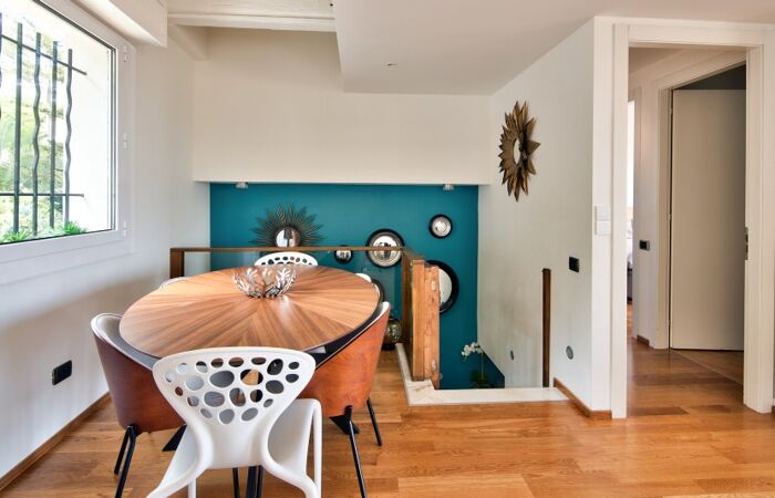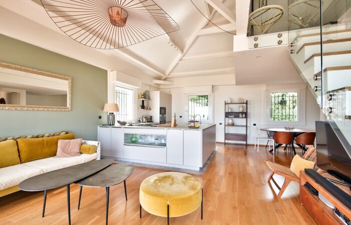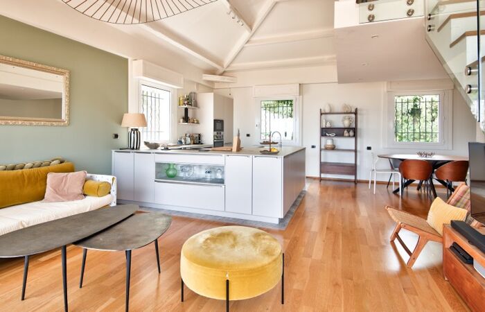 Villefranche sur mer, en dernier étage d'un villa composée de trois appartements située entre la basse et la moyenne corniche, à quelques pas des commerces du col de Villefranche, magnifique appartement de type 4 pièces en parfait état, 86 m² Carrez / 98 m² habitable, exposé Sud, composé de la manière suivante : Hall d'entrée, chambre à coucher, salle d'eau avec WC. A l'étage, vaste pièce à vivre incluant séjour, salle à manger et cuisine US sous plafond cathédrale, deux chambres à coucher, une salle d'eau avec WC, une mezzanine pouvant faire office de chambre ou bureau, dégagements, rangement. La pièce à vivre s'ouvrent sur une profonde terrasse dominant la rade de Villefranche. En complément, la jouissance non exclusive des espaces terrasses et jardins de la propriété ainsi qu'un espace de stockage. Cet appartement à vivre comme une maison saura vous séduire par sa luminosité, ses prestations raffinées et sa vue mer exceptionnelle. A visiter sans tarder.