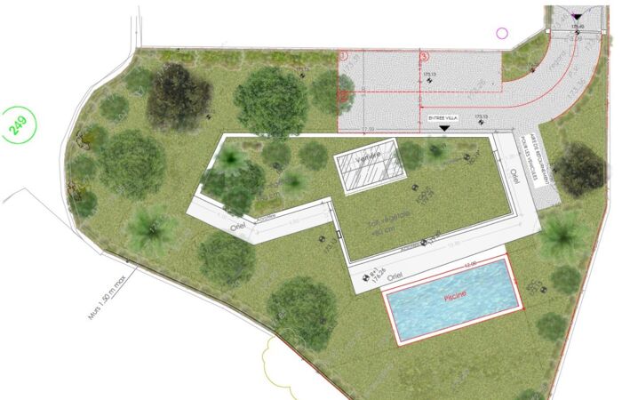 Le projet prévoit également un aménagement comprenant trois places de stationnement ainsi qu'une piscine