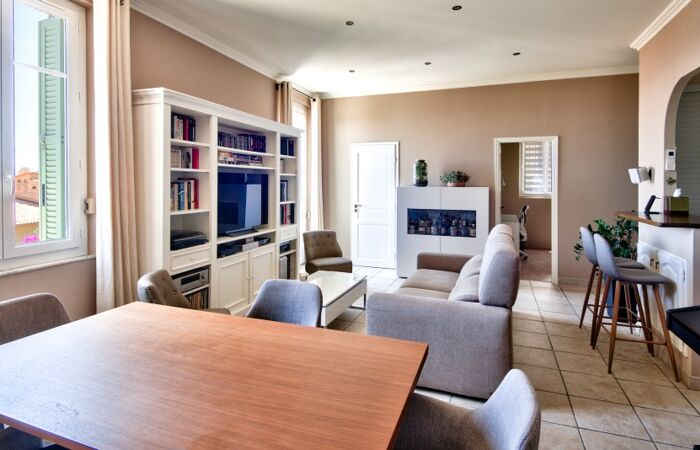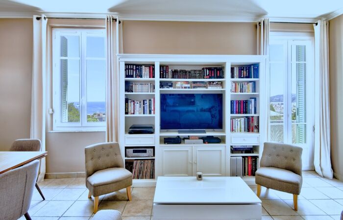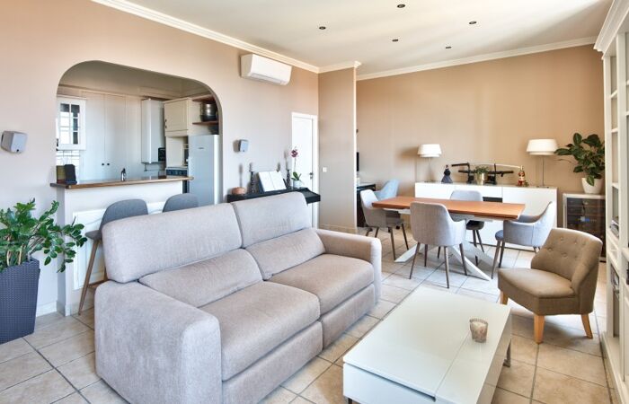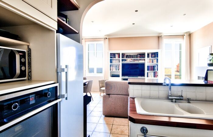 L'appartement confortablement agencé, comprend une entrée avec rangements et dressing, un séjour d'environ 29 m² avec des hauts plafonds, offrant une vue mer et une exposition sud-est. La cuisine équipée est ouverte sur le séjour. Deux chambres confortables et une salle de douche avec WC complètent ce bien.