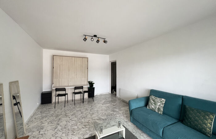 L’appartement, entièrement repeint, se compose d'une entrée avec de nombreux rangements, d'une salle d’eau avec cabine de douche, vasque et WC, d'une cuisine indépendante, aménagée et équipée, ouvrant sur la terrasse et d'une vaste pièce de vie avec salon, canapé-lit, coin nuit équipé d’un lit double escamotable avec véritable matelas et d’un espace bureau intégré.