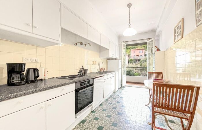 Au 7ᵉ et dernier étage avec ascenseur d'un immeuble aux parties communes impeccables avec gardienne, appartement traversant de 71 m² offrant une belle entrée, une grande cuisine dinatoire, un séjour lumineux, deux chambres exposées est et ouest. Vues dégagées sans vis-à-vis, petit aperçu mer, grande terrasse de 13m² + balcon. Chauffage et eau chaude collectifs, cave. Travaux de rafraîchissement à prévoir. Parking en option au prix de 20.000 e