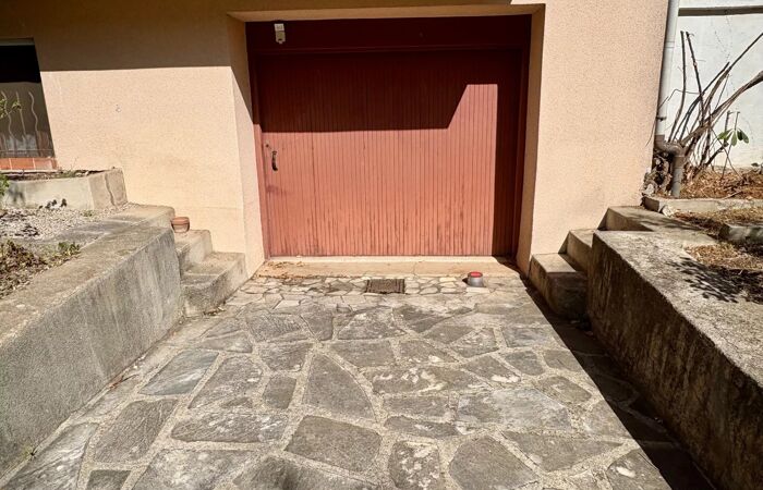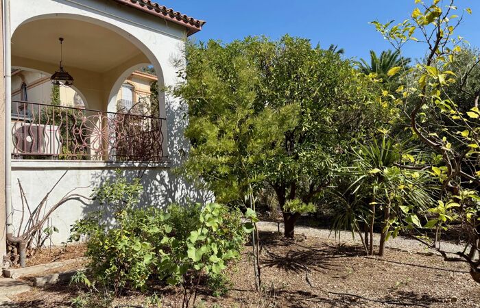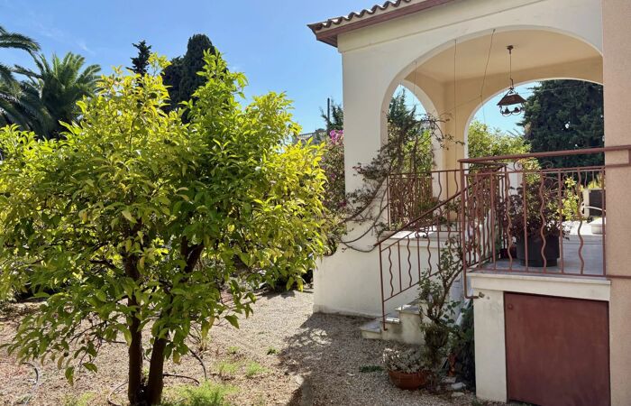 Elle offre 4 chambres, terrasse, buanderie, garage. Terrain plat et arboré de 730m² avec nombreux agrumes.