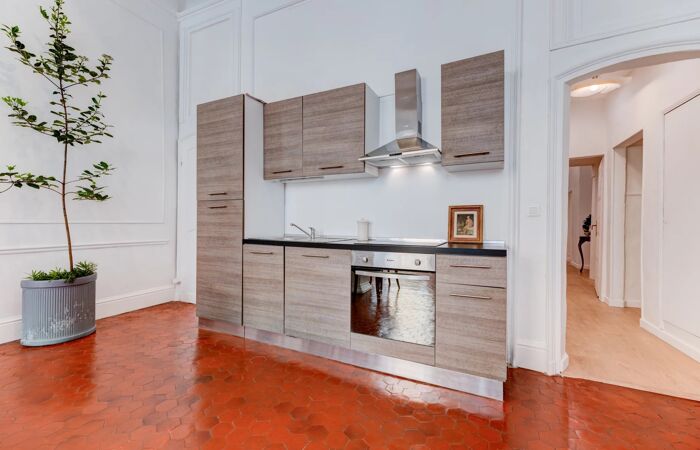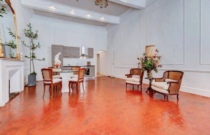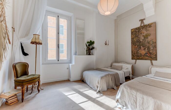 Vieux Nice - 3 pièces dans ancien Palais Vieux Nice : dans un ancien Palais du début du XVIII ème siècle, magnifique appartement d'angle de 3 pièces d'une surface de 83 m2 situé dans le coeur du Vieux Nice. L'appartement au charme authentique est composé d'une vaste entrée avec mezzanine, un magnifique séjour d'environ 40m2 avec de belles ouvertures, une hauteur de plafond de 4m, une cheminée et tommettes d'époque au sol, une cuisine US équipée, une chambre exposée Sud avec vue sur la cathédrale et le château, une seconde chambre, une salle de bain avec douche et WC, un second toilette indépendant et de nombreux rangements. Appartement très atypique avec beaucoup de cachet. Coup de coeur assuré! Les informations sur les risques auxquels ce bien est exposé sont disponibles sur le site Géorisques : georisques.gouv.fr