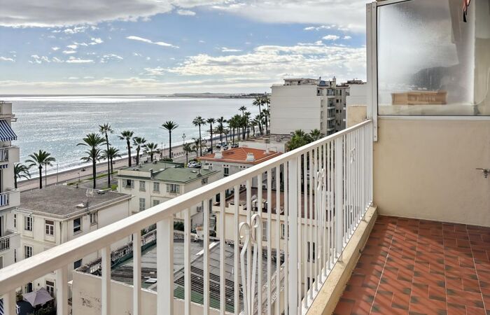 -Côté Sud/Est, le séjour ouvre sur un grand balcon ensoleillé avec une jolie vue sur la mer et la Promenade des Anglais ;