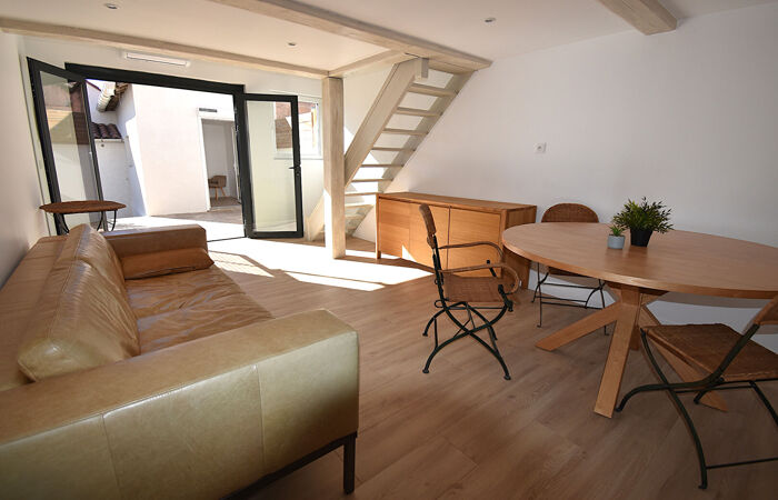 Dans le quartier prisé de Boulouris, appartement 2/3 pièces en duplex rénové avec soin. Cet appartement atypique est composé d'une pièce de vie offrant une belle luminosité en rez-de-chaussée, une cuisine avec son puits de lumière et une salle d'eau avec WC. A l'étage une belle chambre mansardée. Il est complété par une dépendance de 6 m² offrant de belles possibilités telles qu'un coin nuit supplémentaire, un bureau, un atelier, ou autre ... L'ensemble a bénéficié d'une très belle rénovation contemporaine et offre un grand confort grâce à la climatisation réversible et des volets roulants électriques. Votre agence Millésime Immobilier de Boulouris vous propose ce T2/T3 complété par une belle terrasse exposée Sud, un petit jardin et un stationnement extérieur. Laissez le charme opérer...