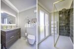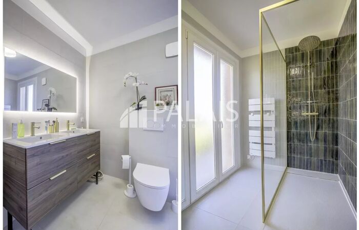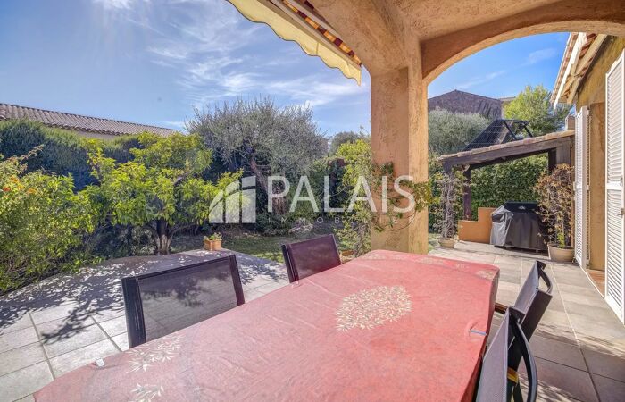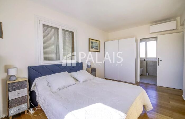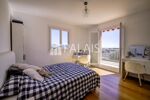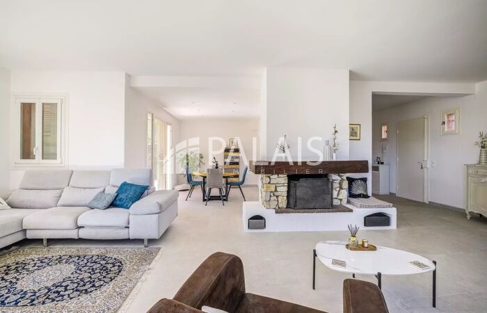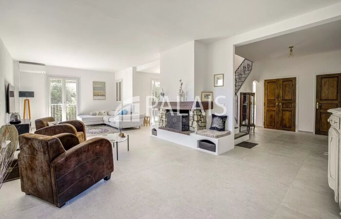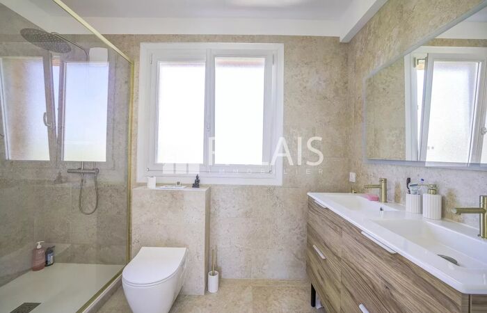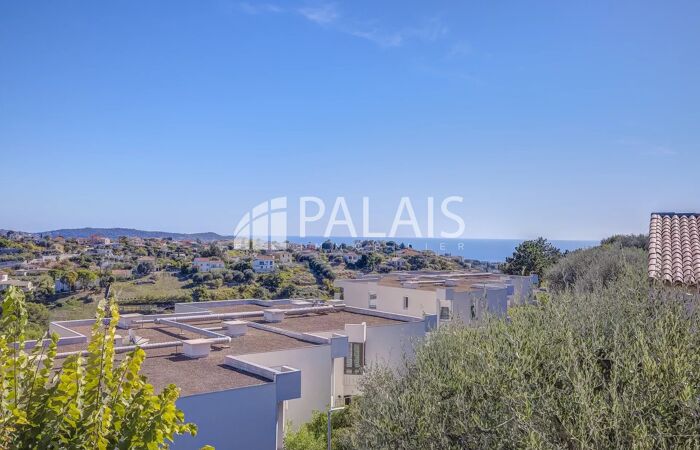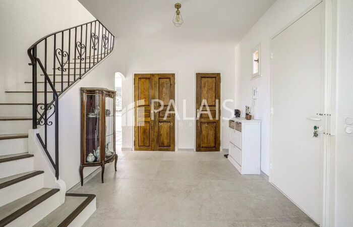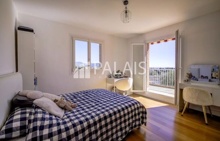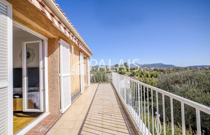 A l'étage, deux chambres avec des placards de rangement donnant sur une belle terrasse offrant une vue dégagée sur les collines et la mer, une suite parentale avec salle de bains et WC, un grand bureau pouvant aussi faire office de chambre, une salle de bains avec WC,