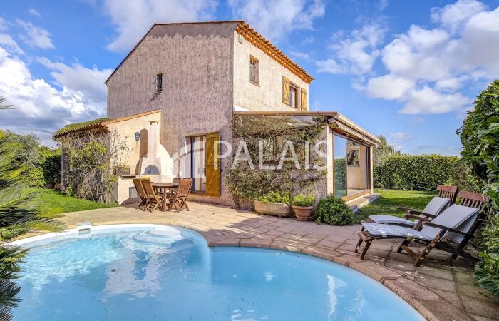 Terrain plat d’environ 300 m2 avec piscine et four à pizza.