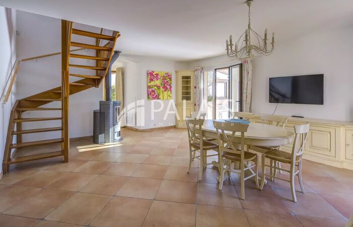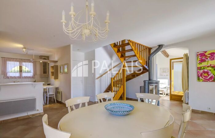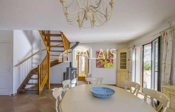 Elle est composée d’une entrée, d'un grand séjour avec cheminée et d'une lumineuse véranda offrant une vue dégagée sur la mer, d'une salle à manger, d'une cuisine équipé ouverte sur l’espace de vie ainsi qu'un WC indépendant,