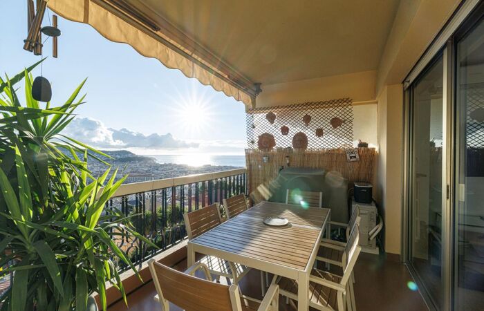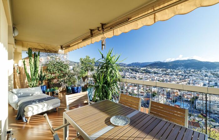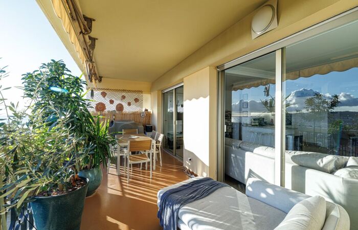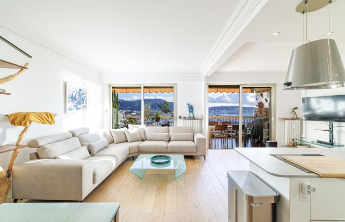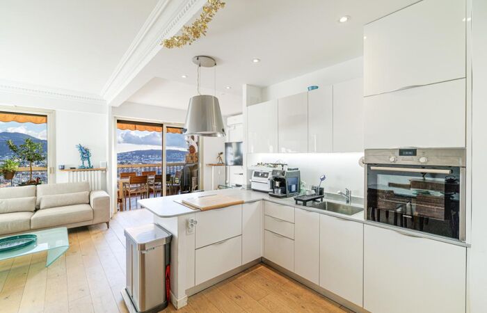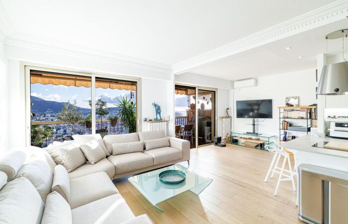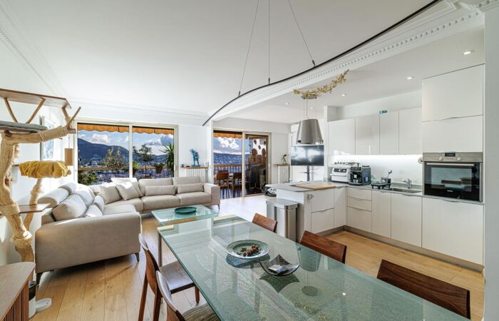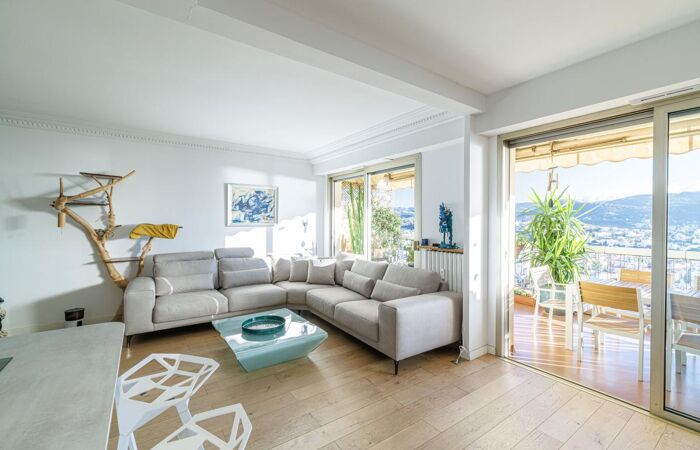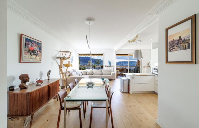 L'appartement s'ouvre sur une entrée accueillante menant à un vaste séjour lumineux, donnant accès à une première terrasse avec une vue dégagée exceptionnelle sur la mer, la ville et les montagnes.