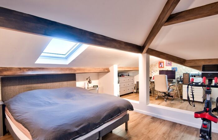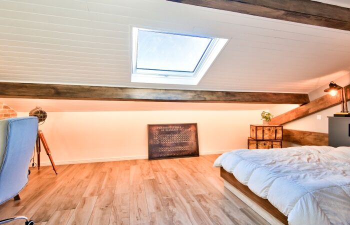 - Au 1er étage : Deux grandes chambres sous les toits avec salle d'eau et WC, ainsi qu'un espace bureau