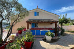Dans une petite résidence avec piscine située au Grand Boucharel, jolie maison avec vue mer comprenant une grande pièce de vie avec cuisine ouverte, une chambre de plain pied et 2 chambres communicantes à l'étage. Très belle terrasse faisant le tour de la maison avec cuisine d'été. Double entrée avec places de parking et garage fermé pouvant être transformé en studio.