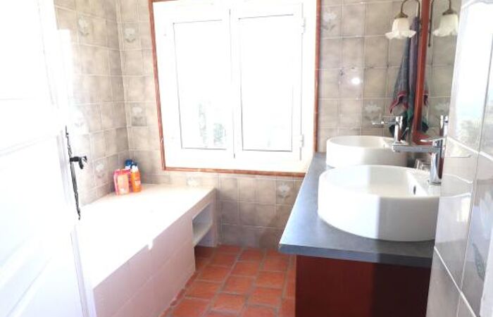 Bâtie sur un terrain de 3500 m² avec piscine (avec douche et WC à proximité), elle bénéficie de plusieurs annexes et d'un abri voiture.