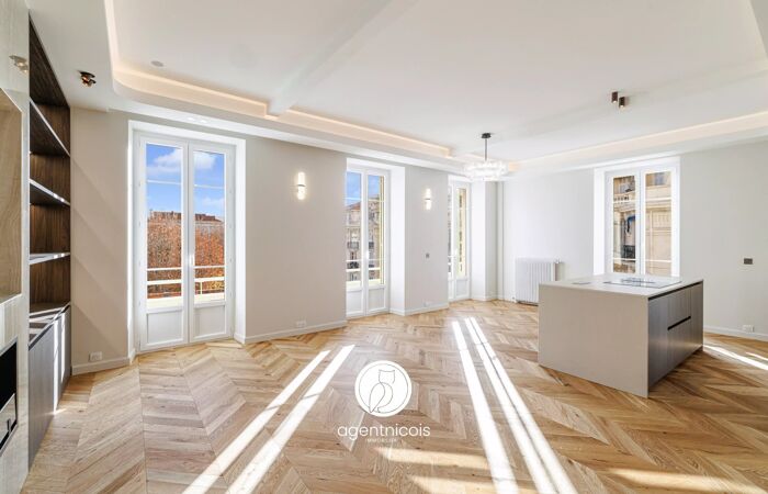 Nice Carré D'or // Ambassador : Traversant - 4 pièces - Balcon - Vue dégagée Nice Carré D'or // Ambassador : Traversant - 4 pièces - Balcon - Vue dégagée Situé au cœur du Carré d’Or, dans l’une des plus belles résidences de Nice, la Résidence Ambassador, cet appartement traversant de 121 m² avec balcon filant, entièrement rénové avec des matériaux haut de gamme, offre un cadre de vie exceptionnel. Baigné de lumière grâce à son exposition plein sud et ses trois fenêtres donnant sur le Square Alziari de Malaussena, l’espace jour se compose d’un vaste Salon / Salle à manger d’environ 50 m² avec cuisine et son ilot central le tout donnant sur un un balcon filant. Un couloir dessert harmonieusement l’ensemble des pièces. L’espace nuit, parfaitement distinct, comprend une suite parentale bénéficiant de sa salle de bains et double vasque, d'un dressing et d'un balcon avec vue degagée. Deux chambres supplémentaires, toutes deux équipées de rangements sur mesure et de leurs salles d’eau privatives. Un WC invité est également présent. Le charme incontestable de l’appartement, la qualité de la copropriété et le calme absolu en font un bien unique dans ce secteur prisé. Une cave complète ce bien, idéalement situé à deux pas de la mer, des lignes de tramway et des commerces du Carré d’Or. Possibilité d'un stationnement en location. Honoraires à la charge du vendeur Bien soumis au régime de la copropriété Nombre de lots dans la copropriété : 44 Aucune procédure en cours (articles 29-1A/29-1 loi 65-557, L.615-6 du CCH) Charges annuelles : 3360euros Consommation énergétique: 110 kWhep/m2.an Emissions de gaz à effet de serre: 16 kgeqCO2/m2.an Montant estimé des dépenses annuelles d'énergie pour un usage standard : entre 860euros et 1180euros sur les années. Les informations sur les risques auxquels ce bien est exposé sont disponibles sur le site Géorisques : georisques.gouv.fr La présente annonce immobilière a été rédigée sous la responsabilité éditoriale de l'agent commercial mandaté pour la vente de ce bien.