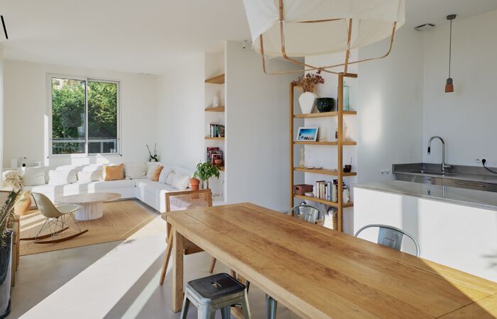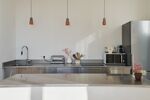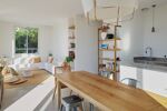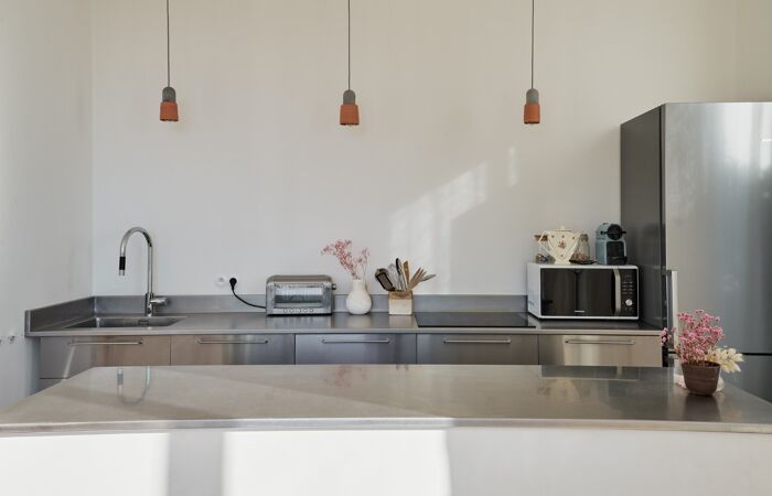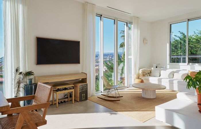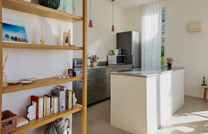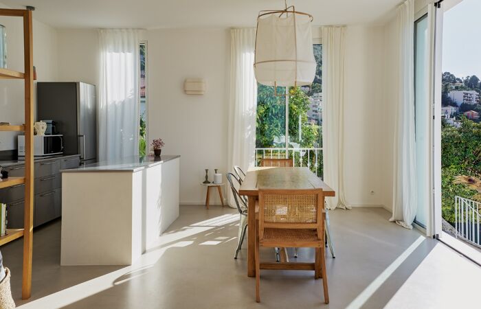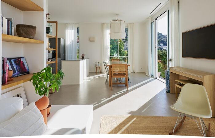 Séjours spacieux de 45m² avec cuisine ouverte avec îlot sur mesure en inox, hauteur sous plafond de 3 mètres et nombreuses baies vitrées offrant une vue magnifique. 3 chambres, 1 salle de bain, WC séparé.