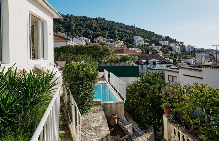 Nice Mont-Boron : villa rénovée avec vue panoramique ville et mer. Position dominante sans vis-à-vis, exposée sud/sud-ouest magnifiques couchers de soleil, au fond d'une impasse privée. Superficie habitable d'environs 130 m² sur un terrain en planches de 500 m², piscine 10 m², studio 32 m² avec salle d'eau, buanderie indépendante et atelier.