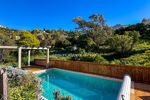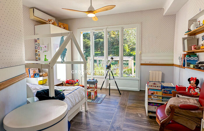Le jardin, joliment aménagé avec des essences méditerranéennes, propose plusieurs terrasses, un espace jeux pour enfants, un terrain de pétanque et une piscine au sel chauffée avec volet roulant, entourée de plages en bois.