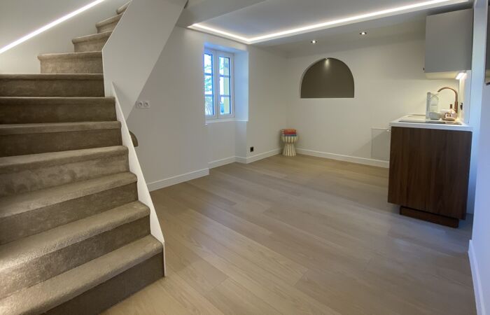 Entièrement rénové avec de belles prestations, l'appartement se compose, au niveau principal, d'une entrée et d'un séjour avec cuisine américaine équipée.