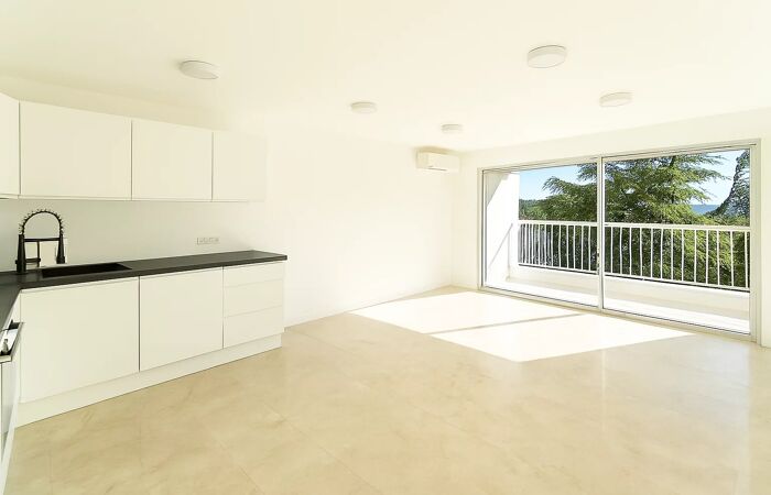 Appartement 3 pièces Corniche Fleurie – Dernier étage – Vue mer panoramique Superbe 3‑pièces entièrement rénové, traversant et baigné de lumière, situé au calme absolu dans une résidence de standing avec piscine, à deux pas des commodités. L’appartement s’ouvre sur un spacieux séjour avec cuisine ouverte contemporaine, prolongé par une large terrasse offrant une superbe vue panoramique. Il dispose de 2 chambres, dont une avec accès direct à la terrasse, d’une salle d’eau élégante avec douche à l’italienne et de toilettes indépendantes. Une place de parking ainsi qu’une cave complètent ce bien aux prestations soignées.