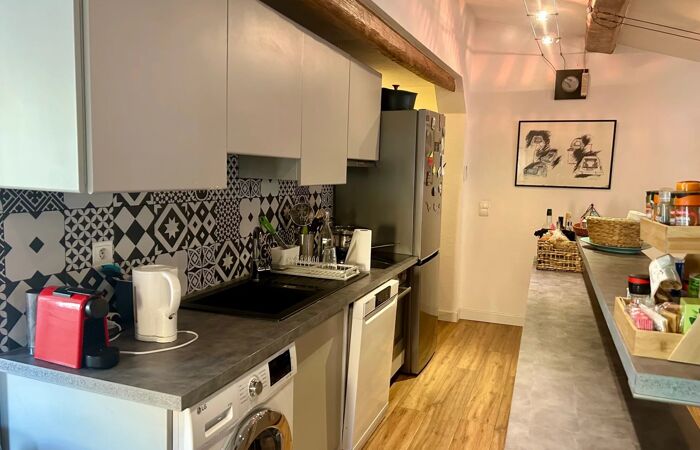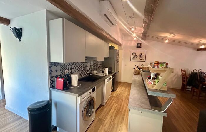 Il se compose d’une entrée, d’une cuisine américaine entièrement équipée avec îlot central, d’un séjour au plafond agrémenté de poutres apparentes, apportant une atmosphère chaleureuse et typiquement niçoise.