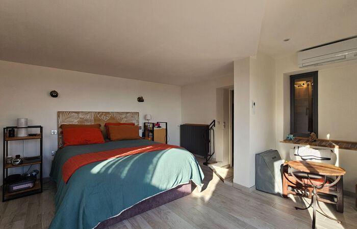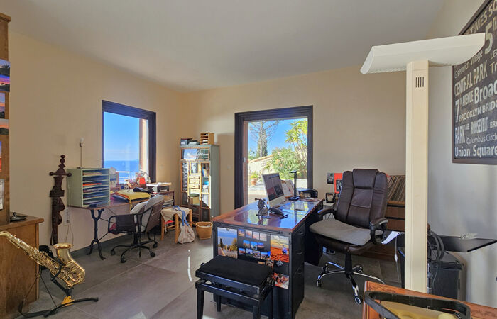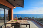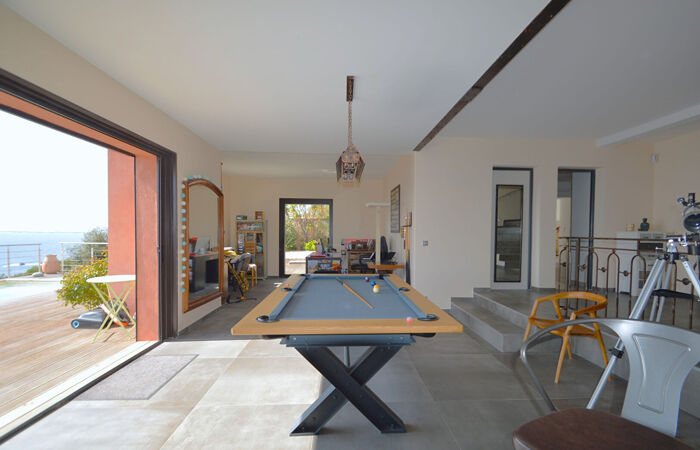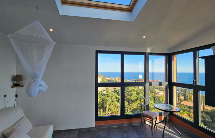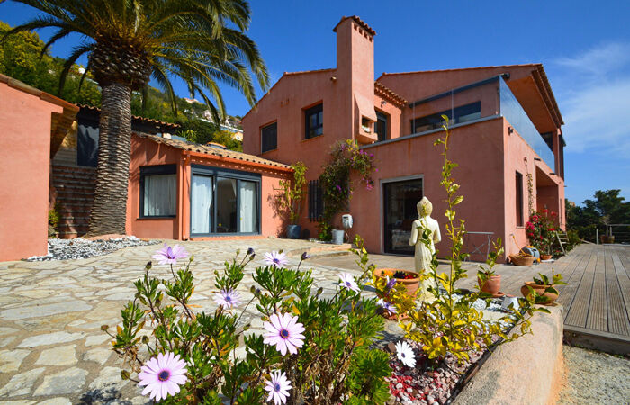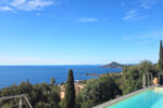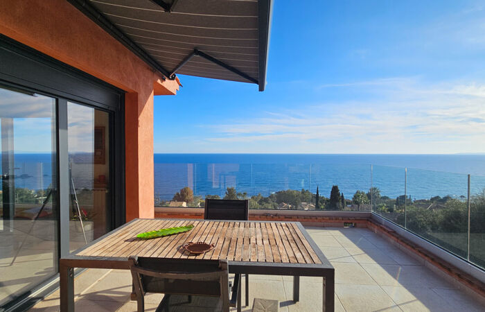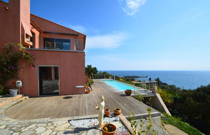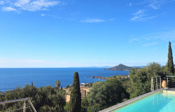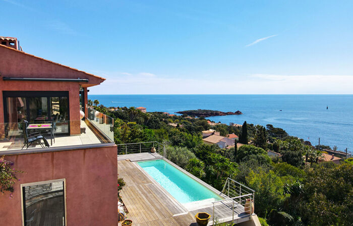 Située en position dominante dans le quartier d'Anthéor avec une magnifique vue mer, cette propriété rénovée est établie sur un terrain de 1446m² et profite d'une ouverture à 180° sur l'horizon Méditerranéen lui offrant un panorama d'exception jusqu'à Saint-Tropez. La villa d'une surface de 237m² incluant les dépendances se compose d'une partie à vivre sur 215m² environ, comportant notamment 3 chambres climatisées dont une suite parentale de 40m², une cuisine moderne ouvrant sur terrasse, un séjour de 67m² avec chauffage au sol prolongé d'une spacieuse terrasse agrémentée d'une piscine chauffée type couloir de nage de 9 x 2.25m avec volet. Un annexe de 10m² environ permet d'accueillir un bureau ou une chambre d'amis. Un garage à moto, des parkings et un carport fermé viennent en complément. La villa profite également d'une cave et de combles pouvant servir d'espaces de rangement annexes et d'un jardin en restanques aménagées.