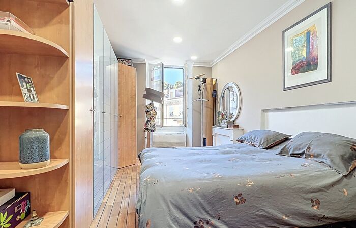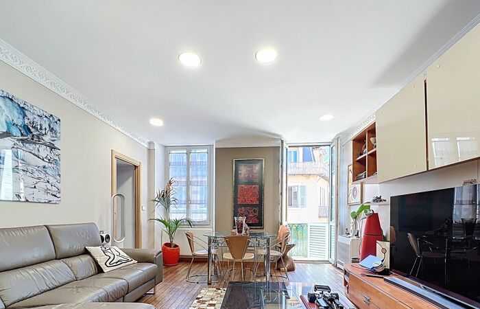Cet appartement de charme se situe au 4ᵉ étage d'un superbe immeuble niçois récemment mis en valeur par la requalification de la rue Cassini.