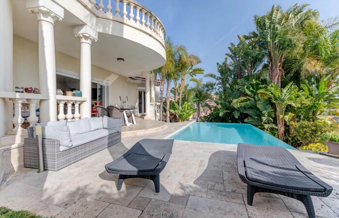La villa s’articule autour d’un vaste espace de réception lumineux, largement ouvert sur l’extérieur grâce à de grandes baies vitrées à galandage. Le séjour se prolonge naturellement vers une spacieuse terrasse plein Sud et une piscine chauffée à débordement, offrant un panorama spectaculaire.