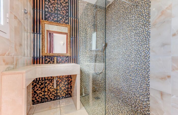 chauffage réversible gainé, baies vitrées à galandage avec moustiquaires, système de sécurité renforcé, matériaux nobles (marbre, mosaïque, ferronneries).