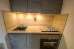 Une entrée ouvrant sur une pièce de vie spacieuse avec cuisine moderne entièrement équipée.