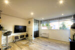 Un espace salon lumineux et un placard intégrant une buanderie.