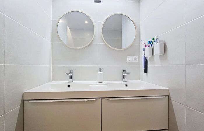 • Salle d’eau moderne avec double vasque et WC.