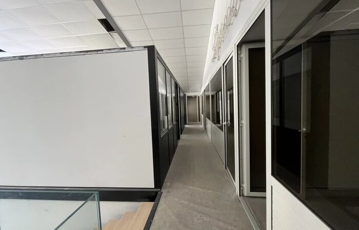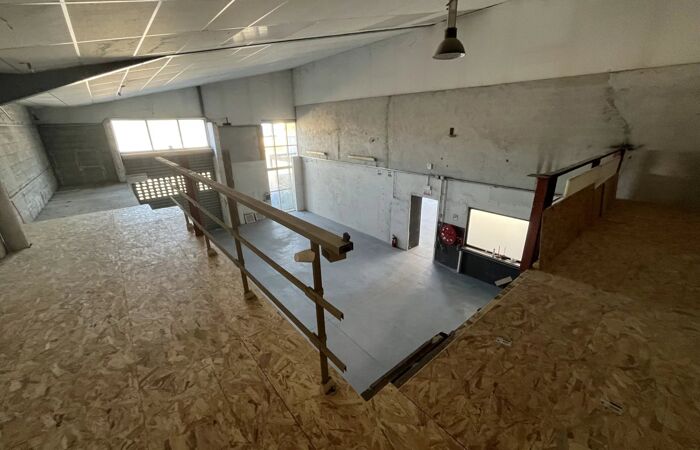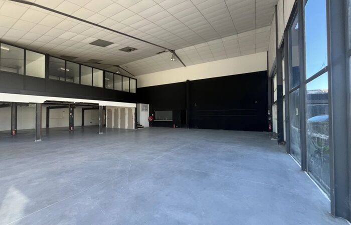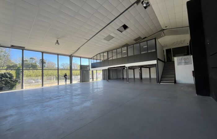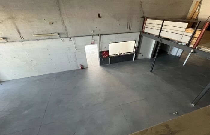 Le local comprend une surface commerciale de plain-pied d'environ 600 m² avec accès public, et une porte sectionnelle électrique pour l'accès à l'atelier, + une mezzanine comportant 175 m² de bureaux cloisonnés et climatisés, et 100 m² de mezzanine pour du stockage.