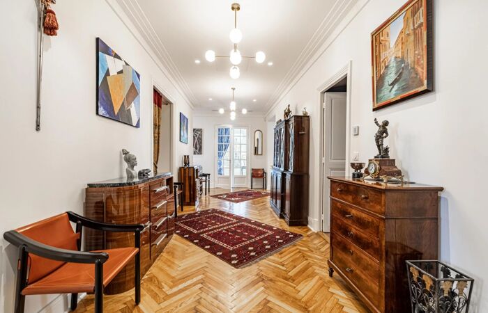 Traversant et baigné de lumière avec ses 6 portes fenêtres plein sud et ses 5 côté ouest, au total 14 fenêtres toutes équipées de double vitrage et 3 petits balcons, l’appartement bénéficie d’une triple exposition. Le vaste séjour, prolongé par des balcons plein sud, offre un cadre de vie raffiné et chaleureux.