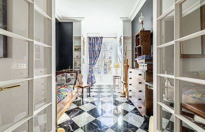 Dès la vaste entrée, les volumes captivent : hauteurs sous plafond impressionnantes, parquet noble et lumière omniprésente.
