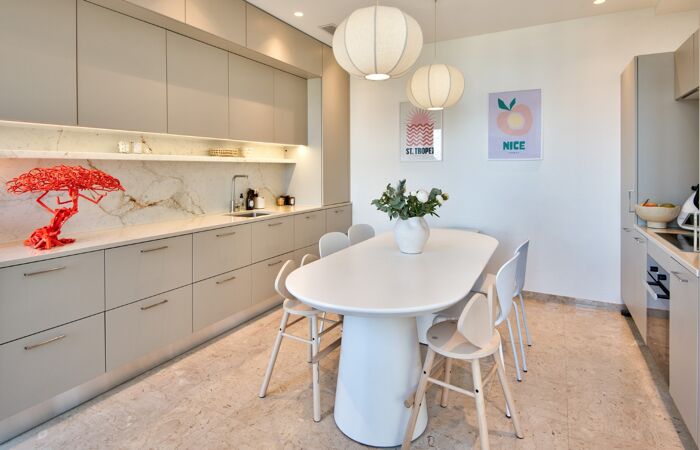 La propriété se compose d'un vaste séjour baigné de lumière, ouvrant sur une vue sur la baie des anges à couper le souffle. Une spacieuse cuisine indépendante, aménagée et équipée complète ce niveau.