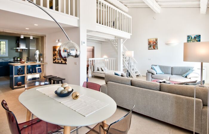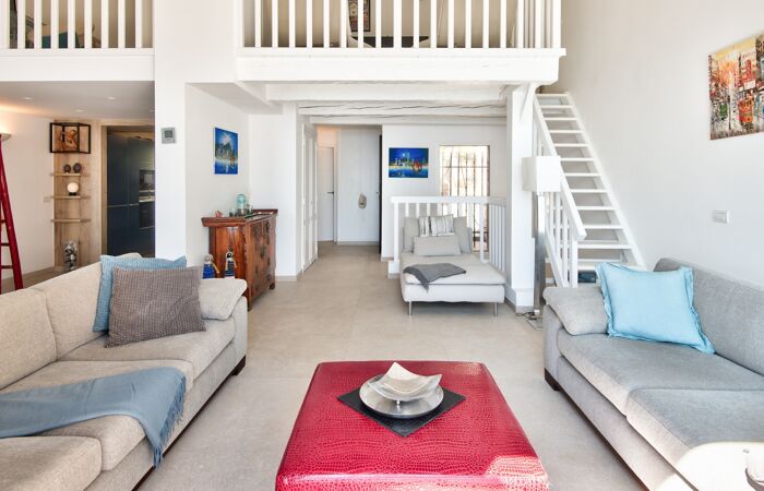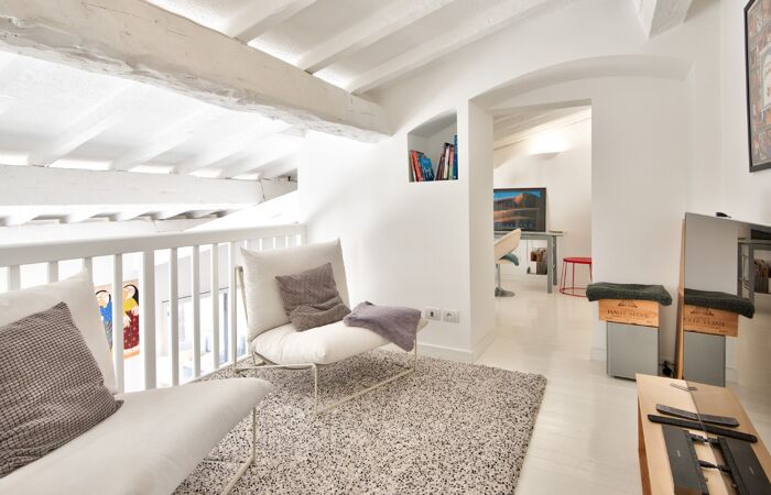 Premier niveau (environ 53 m²) : une entrée, un spacieux séjour lumineux avec cuisine ouverte entièrement équipée, un espace salle à manger, donnant sur une terrasse de 20,39 m², ainsi qu'un WC invités. Mezzanine (environ 16 m²) : un bureau et un salon TV.