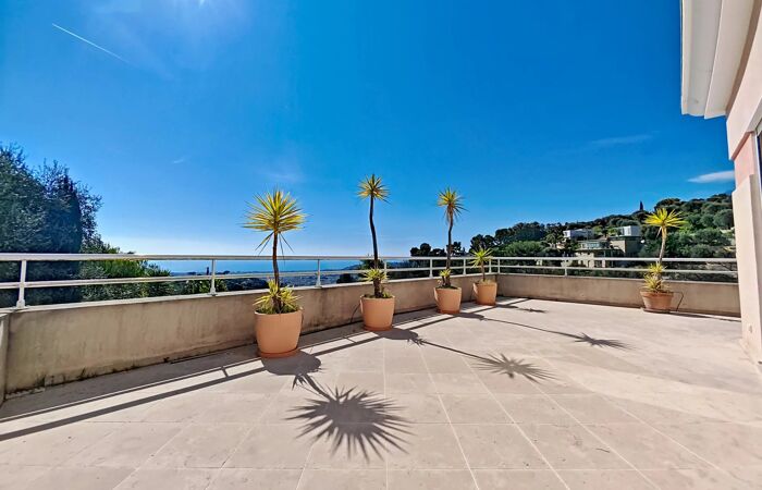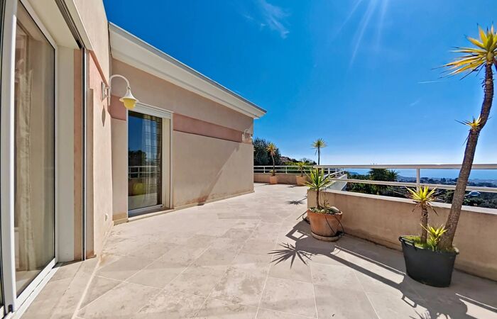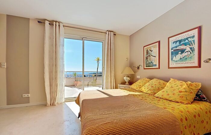 Un vaste espace d’accueil dessert : Deux chambres avec salle de bains et WC indépendant, une suite avec salle de bains et WC, plusieurs espaces de rangement, un dégagement lumineux avec baie vitrée. Toutes les chambres bénéficient d’un accès direct à une grande terrasse exposée plein sud, offrant une vue panoramique sur la mer et toute la ville de Nice.