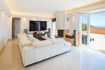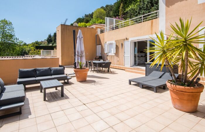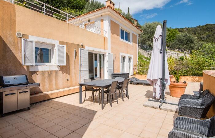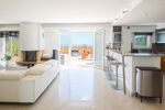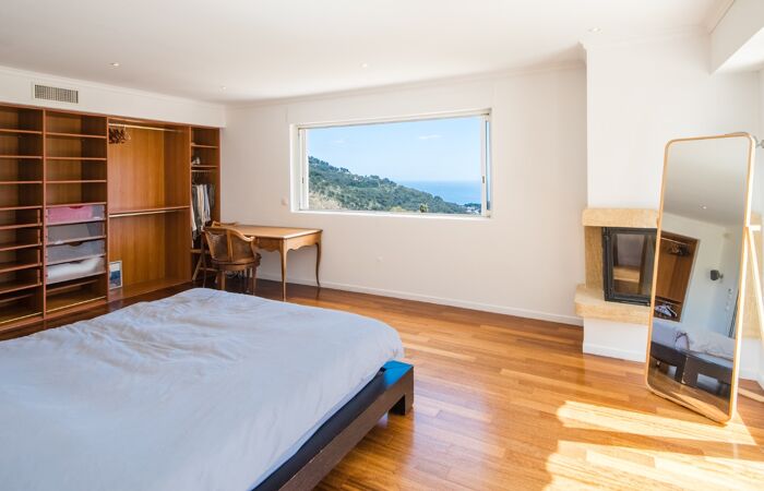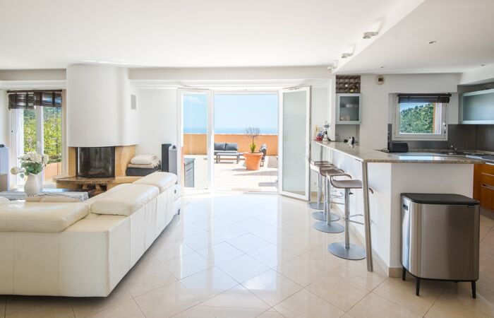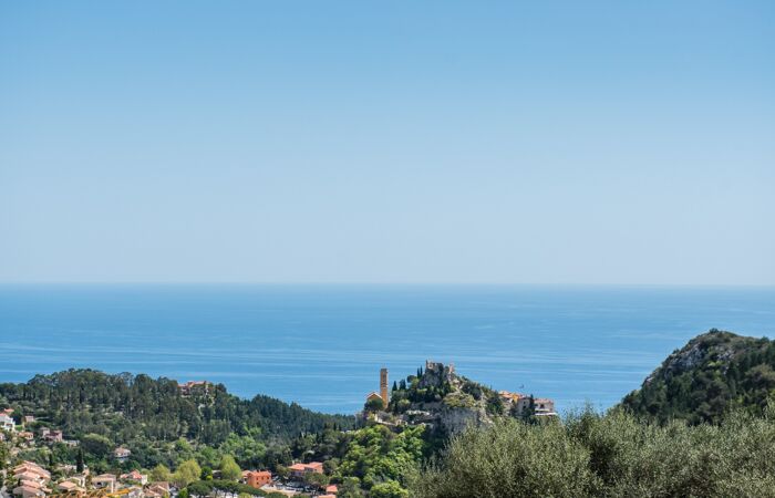 Dès l'entrée, découvrez un séjour de 50 m² avec cheminée et cuisine américaine équipée, ouvert sur une terrasse de 110 m² avec vue sur la Méditerranée et le village médiéval d'Eze.