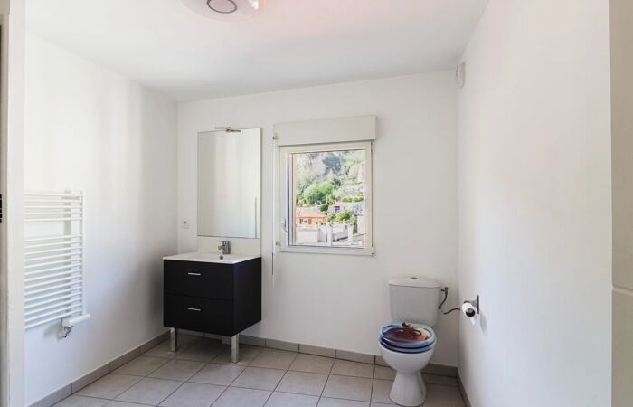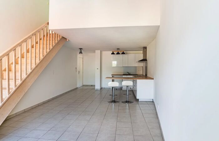 Au rez-de-chaussée, un séjour/cuisine de 30 m² sous hauteur cathédrale ouvre sur un balcon sans vis-à-vis, avec vue dégagée sur les collines. Une salle d'eau complète ce niveau.