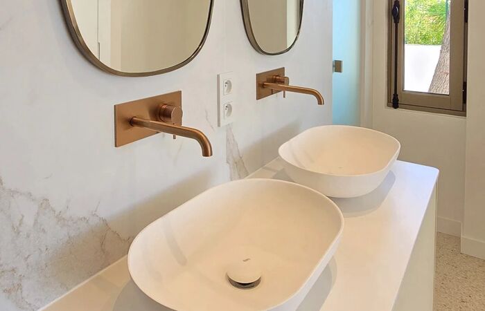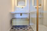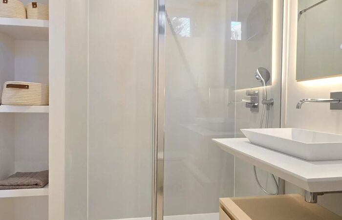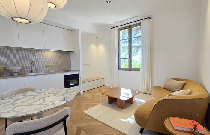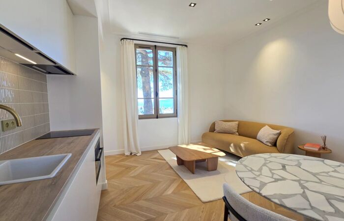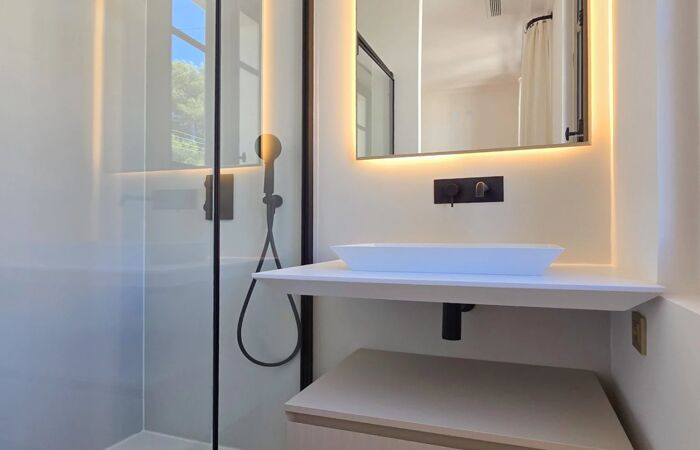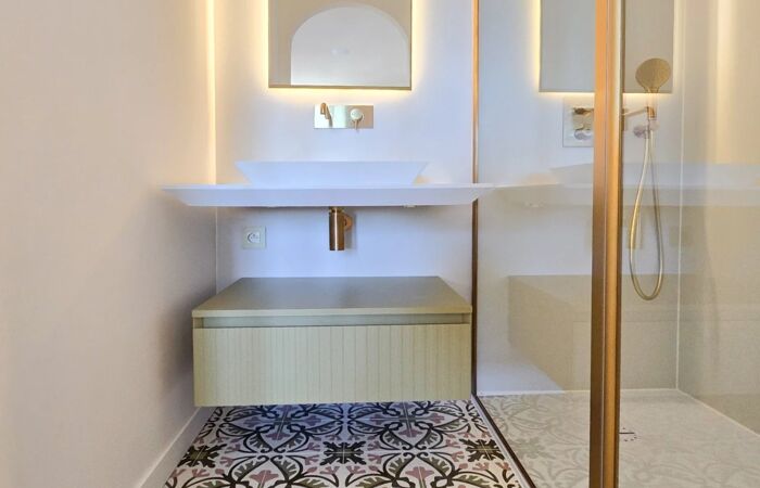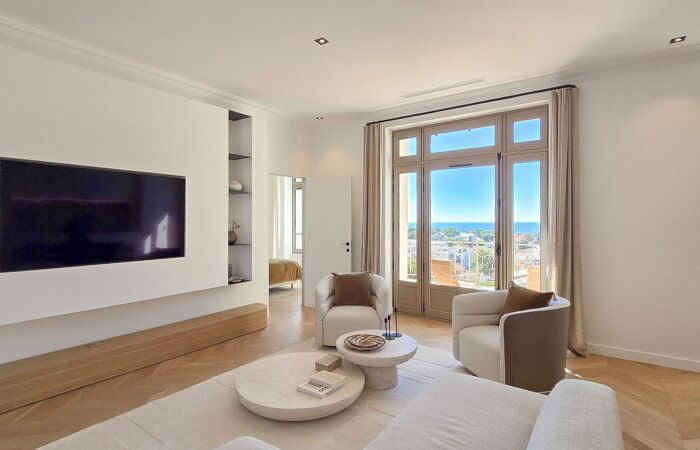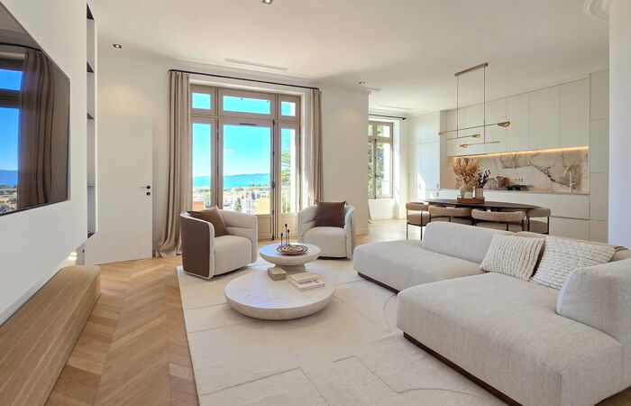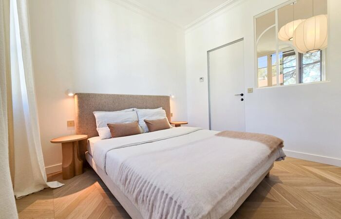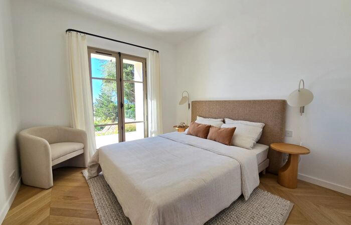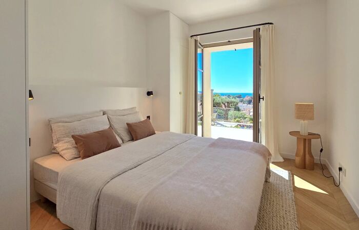 Orientée vers la mer et exposée plein sud, l’ensemble des pièces bénéficient d’un paysage contemplatif sur la méditerranée et d’une belle luminosité tout autant par ses larges ouvertures traversantes que ses hauts plafonds.