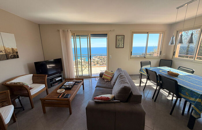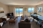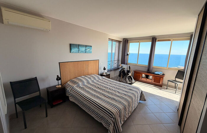 À l'étage principal : Une pièce de vie lumineuse s'ouvre sur une terrasse face à la mer, complétée par une cuisine américaine et deux chambres en suite (chacune avec salle d'eau et WC), dont une suite de maître avec un accès direct à l'extérieur.