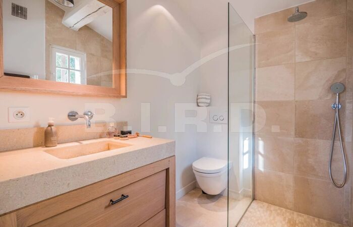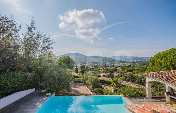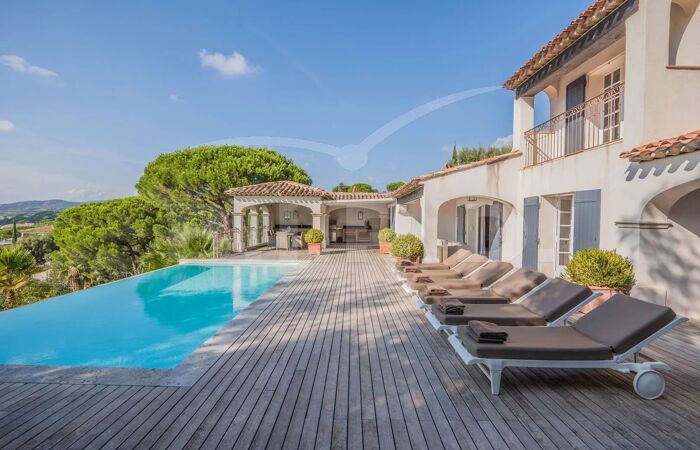 Villa à pied du centre de Sainte-Maxime Côte d'Azur, Sainte-Maxime, Sémaphore, en situation dominante, proche du centre ville (15 min à pied) et des plages, bénéficiant d'une magnifique vue, confortable VILLA de caractère rénovée récemment agrémentée de larges terrasses, d'un pool house avec cuisine (réfrigérateur, barbecue) et d'une grande piscine à débordement.