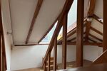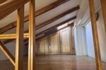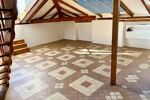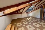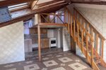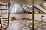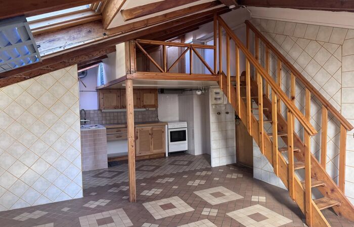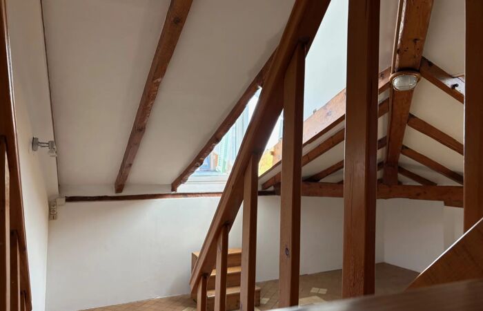 La vaste pièce principale, mansardée, offre de beaux volumes et une atmosphère chaleureuse avec des poutres en bois apparent, une mezzanine accueillant le couchage.