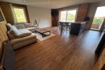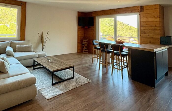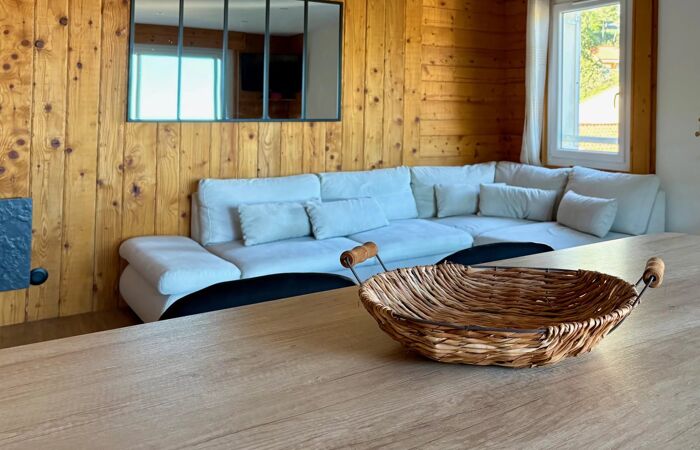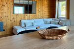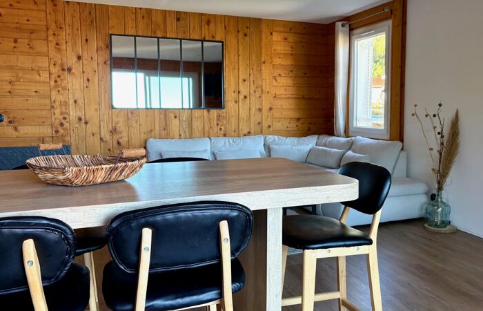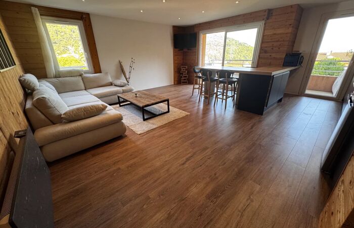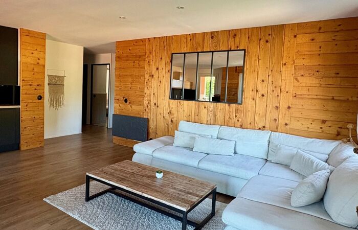 Le vaste séjour, sublimé par un magnifique parquet, s’ouvre sur une grande terrasse offrant une vue dégagée mer et nature.
