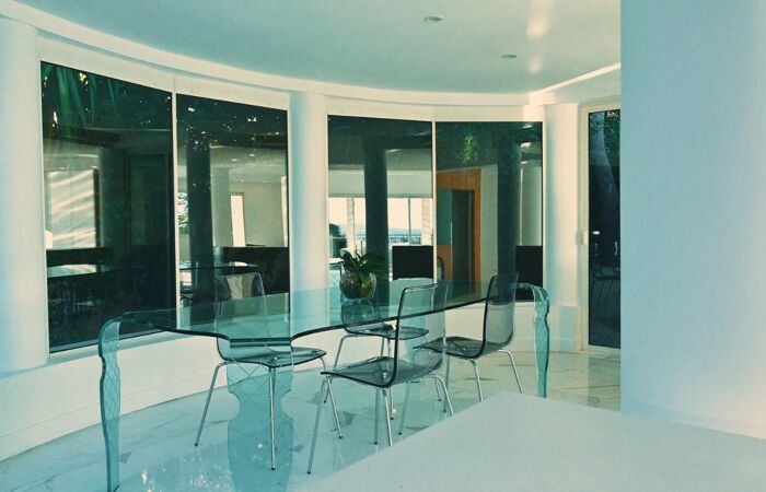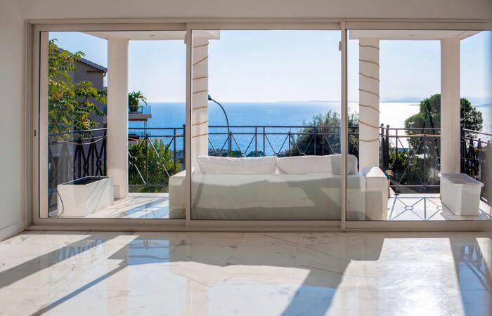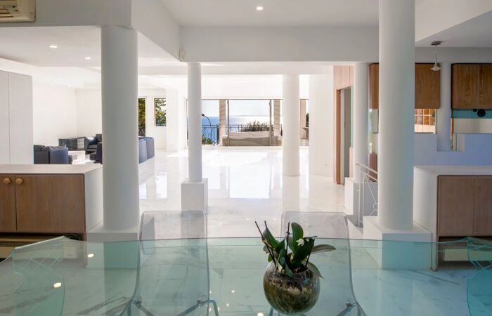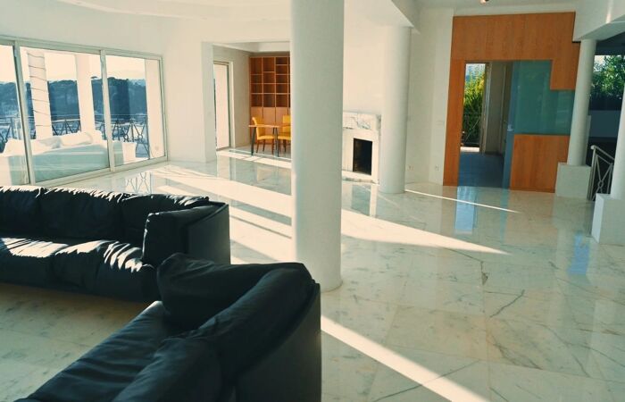 - au 3ème étage : cuisine, toilettes, réception et séjour de 120 m² donnant sur une terrasse avec vue panoramique sur la baie des anges.