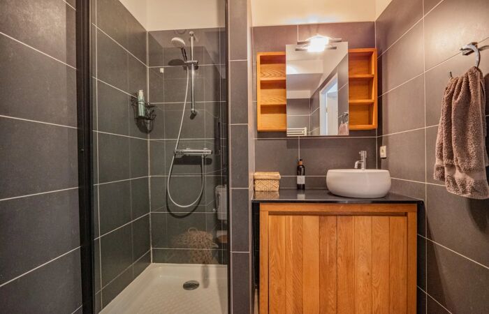 De l’autre côté de l’entrée, vous disposerez d’une belle chambre donnant sur le jardin ainsi que d’une salle de douche avec WC.
