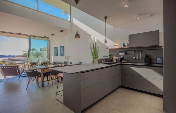 VILLA MODERNE AVEC VUE MER PROCHE PLAGE & CENTRE-VILLE À Sainte-Maxime, située dans une résidence calme et sécurisée, cette villa moderne de 140 m², orientée plein sud, offre une vue mer panoramique sur le golfe de Saint-Tropez. Son emplacement privilégié permet d’accéder à pied à la plage (150 m), aux commerces, aux restaurants et aux bateaux verts pour rejoindre Saint-Tropez.