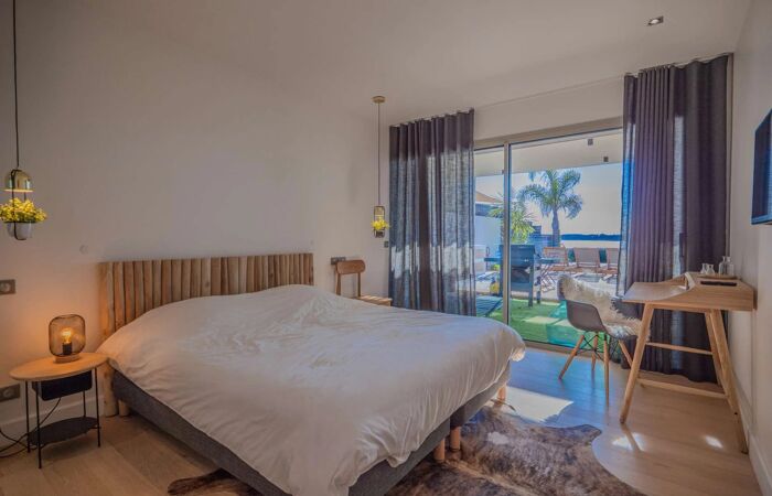L’extérieur a été pensé pour la détente : piscine à débordement (4,6 × 3 m), grande terrasse en bois avec salon extérieur, transats et coin repas.