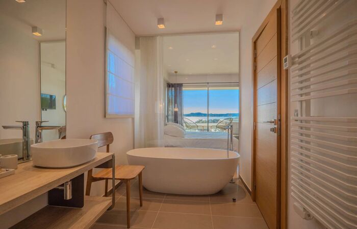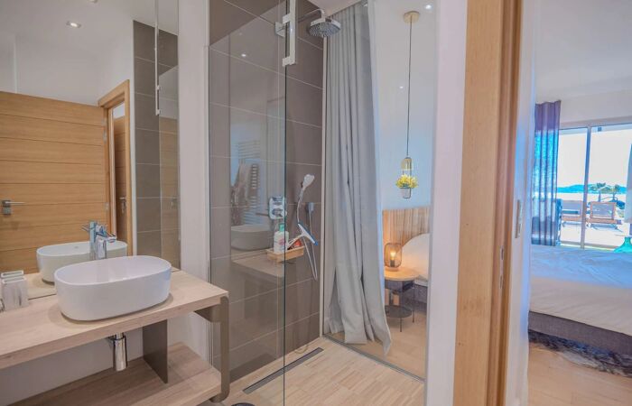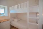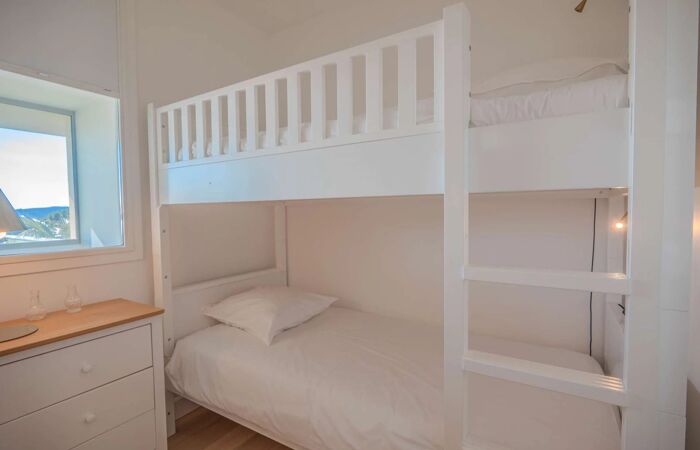 À l’étage : une chambre de maître avec salle de bains (baignoire + douche, WC) et terrasse avec vue mer. Une seconde chambre avec salle d’eau, un espace TV et une chambre d’enfants avec lits superposés.